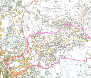 Carte avec limite de la Mairie de quartier (tiret) et notre limite approximative en trait rose