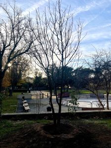 > Plantations au parc Rambot, : La première phase de requalification du parc se termine avec des plantations généreuses autour de l’aire de jeux nouvellement remaniée. Les arbres en cépée sont des pistachiers de Chine ( pistacia sinensis), les arbres sur tige sont des ormes ( ulmus parvifolia).