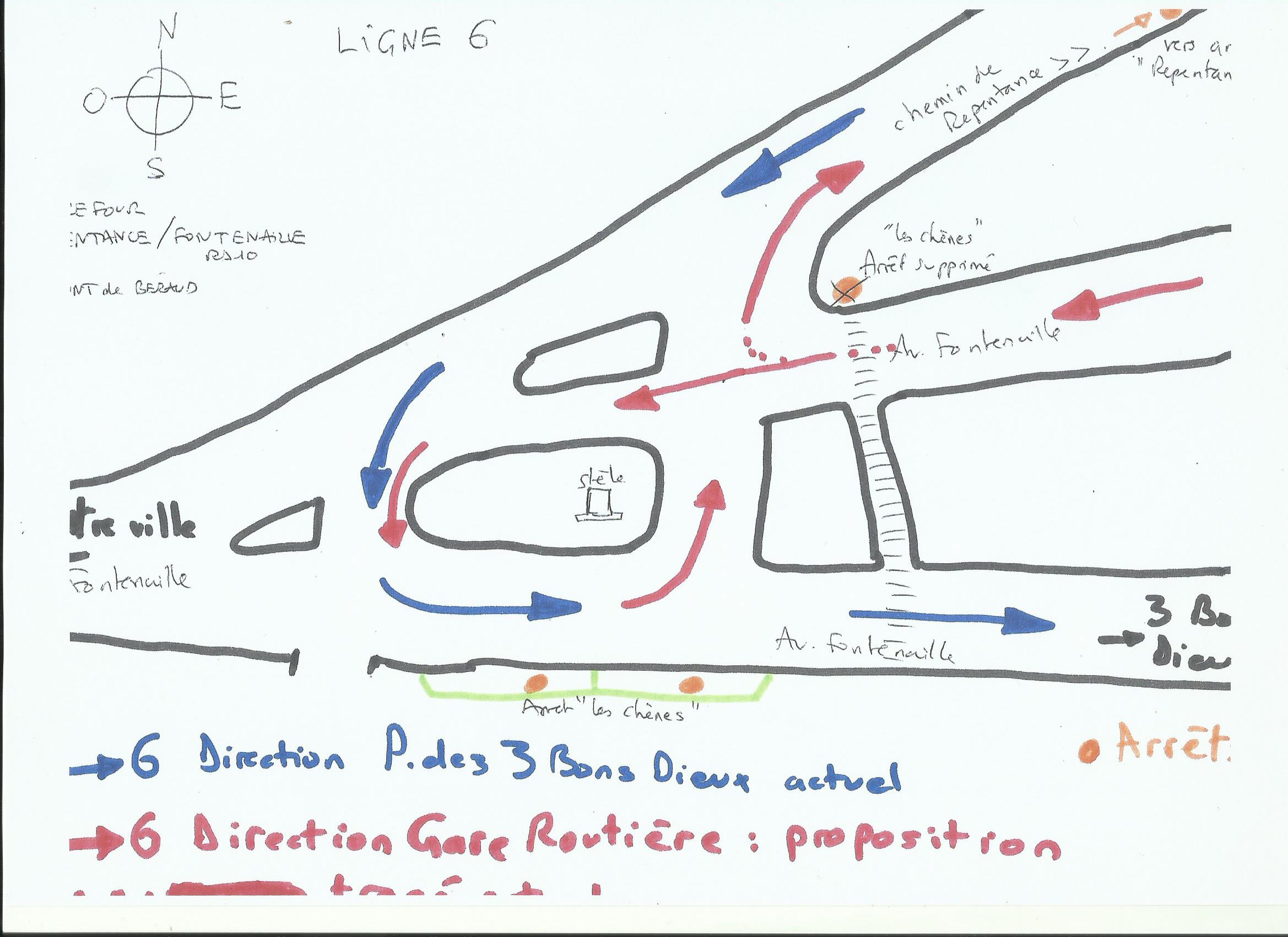 Suite à la suppression de cet arrêt très utile, et contestant la solution préconisée par Keolis de monter à l’arrêt  « Repentance », notre CIQ et le CIQ NE ont écrit à Keolis. Notre proposition , soufflée par des usagers avertis , consiste à faire faire le tour de la stèle par le bus venant du terminus 3 Bons Dieux, avant de remonter le chemin de Repentance . Ainsi, il peut utiliser l’arrêt confortable du bus allant au terminus des 3 Bons Dieux.