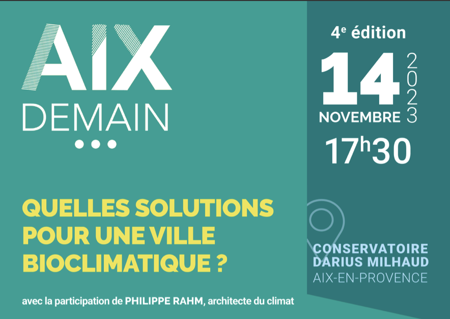 Le séminaire « Aix demain » se déroulera au conservatoire Darius Milhaud, dès 17h30, le mardi 14 novembre 2023 avec notamment la participation de Philippe Rahm, architecte du climat. Cet événement sera également retransmis en direct sur la chaîne YouTube de la Ville d’Aix-en-Provence.