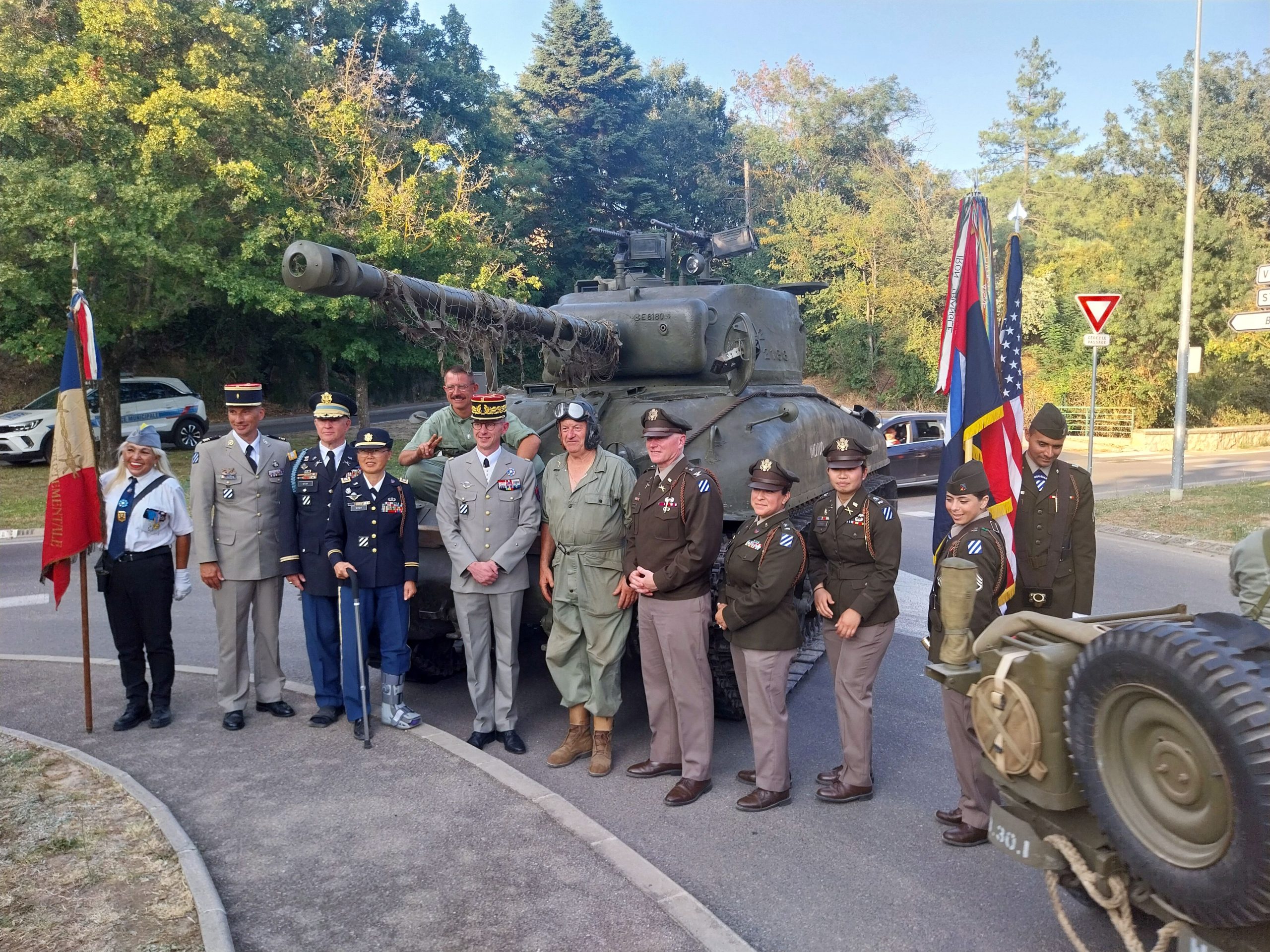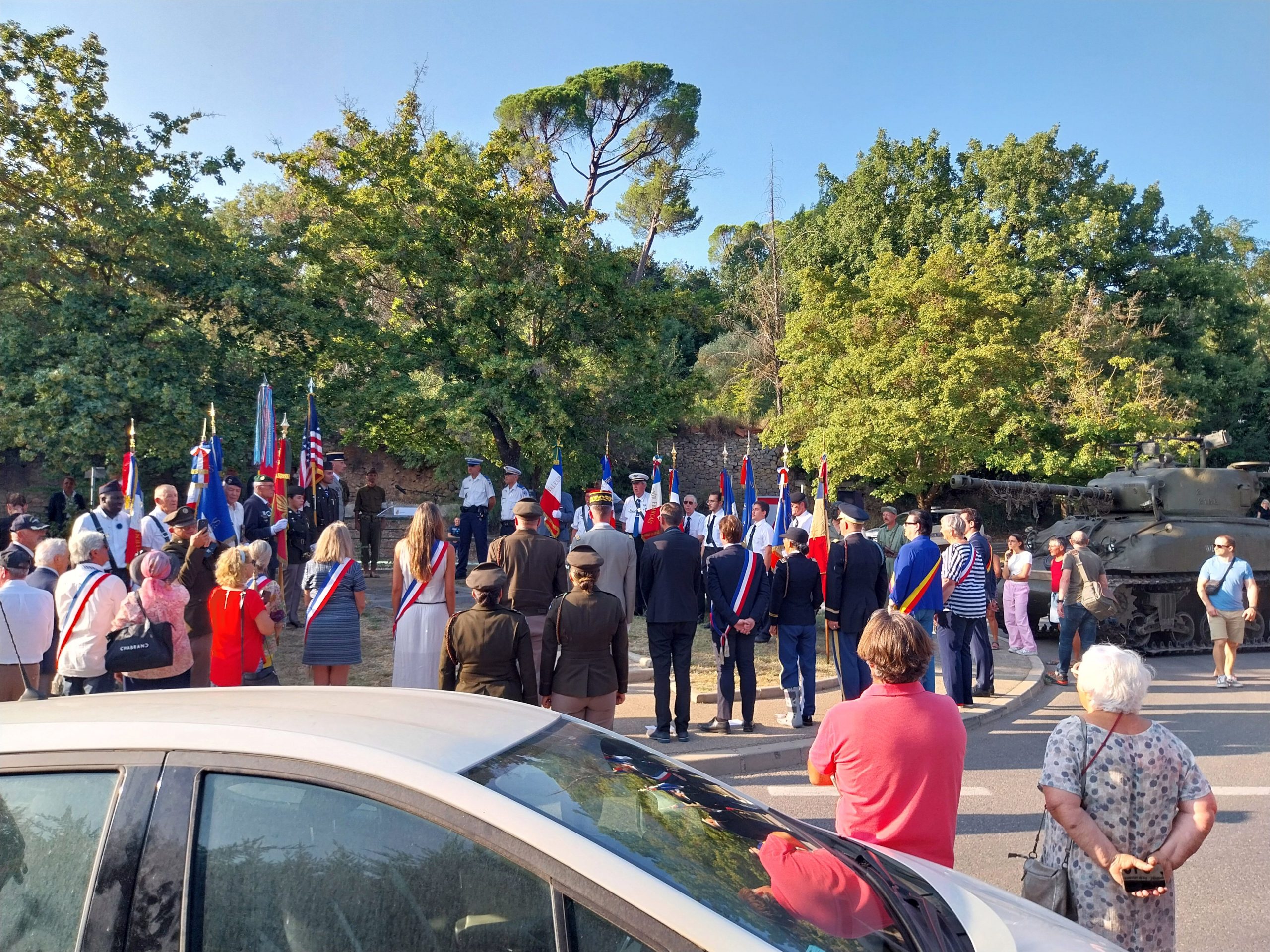 Malgré la chaleur, le public était présent là où c’était possible, à cet endroit historique du retour de la Liberté à Aix. Grâce à l’association Forty For Memory, 3 jeeps et un char Sherman avaient réussi à se trouver une place, à l’endroit exact immortalisé le 21 Aout 1944.