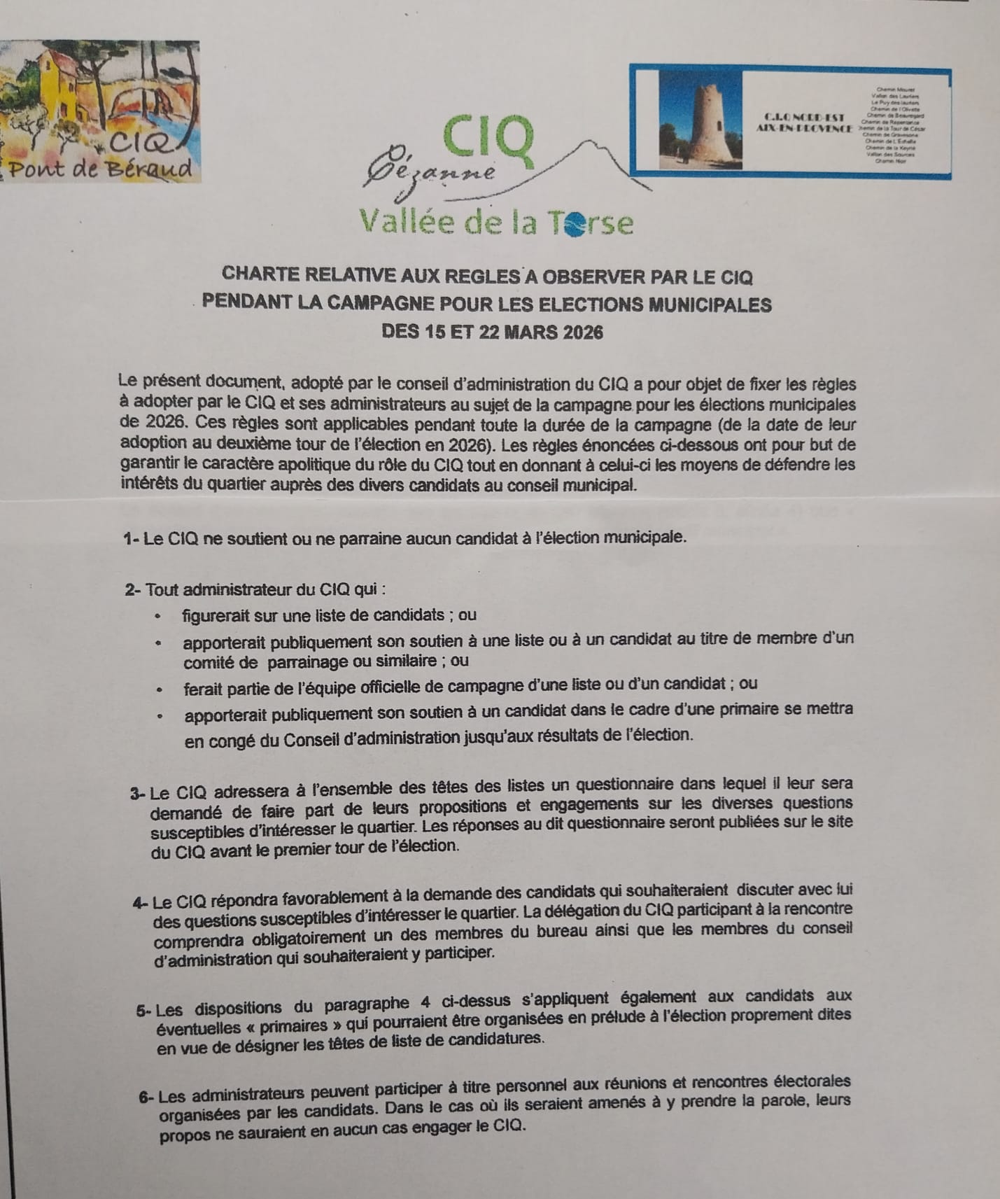 Aussi, avec l’autorisation du CiQ Cezanne La Torse qui en est l’auteur, notre Conseil d’Administration a validé à l’unanimité » La Charte ………. ». Le CiQ Nord-Est rejoint également cette Charte.