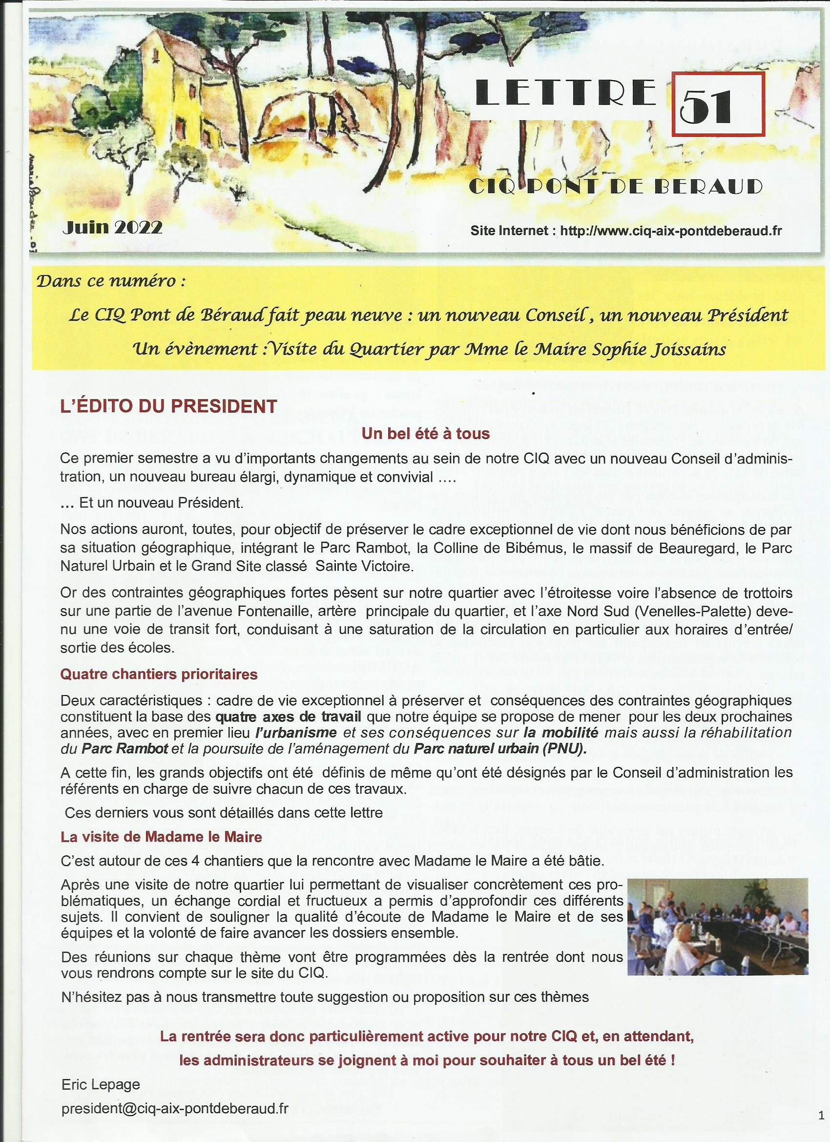 Le CIQ Pont de Béraud vous invite à prendre connaissance de la Lettre de Quartier n° 51