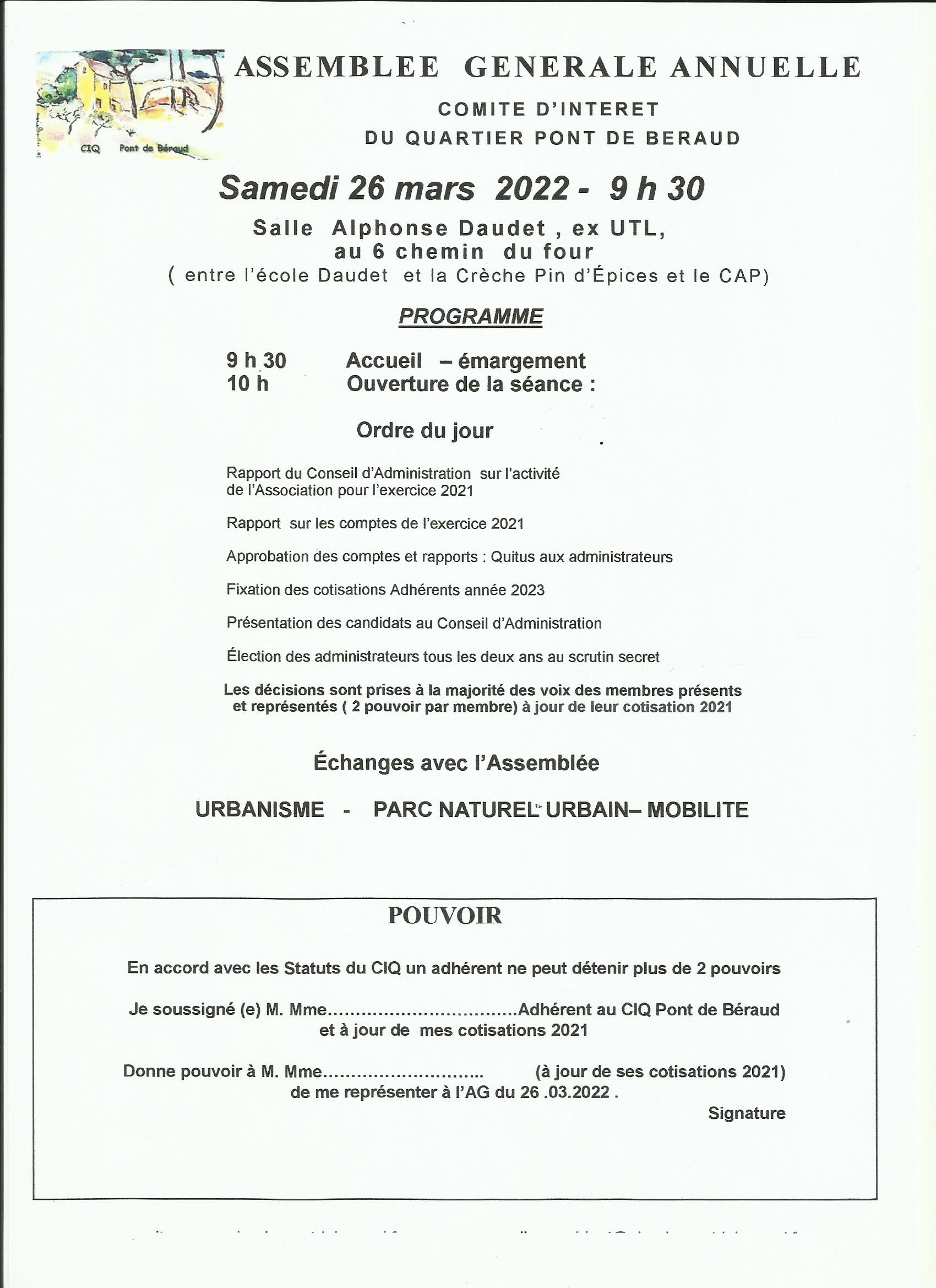 Vous êtes ici : Accueil 9 Actualités 9 CONVOCATION A L’ASSEMBLEE GENERALE DU CIQ PONT DE BERAUD – SAMEDI 26 MARS 2022