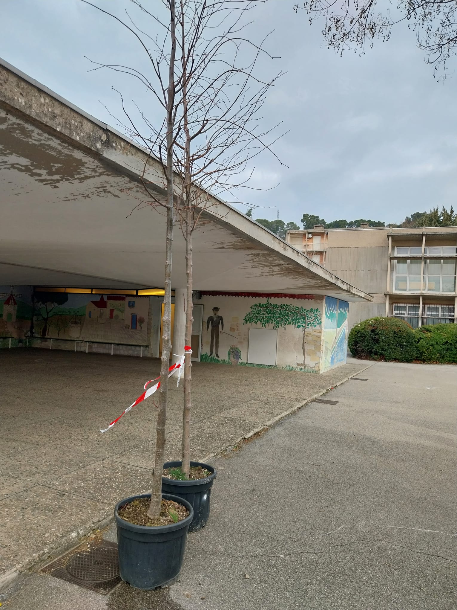 La cour d’une école est un beau symbole et ces 2 grands tilleuls ( Tilia Platyphyllos ) ont trouvé leur place, côte à côte, dans l’alignement des platanes, visible depuis le chemin de Beauregard, dans l’axe de la montagne Sainte-Victoire et au milieu des rires des enfants.