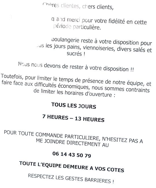 La boulangerie sera ouverte tous les jours de 8 h à 13 h et fermée l’après -midi.