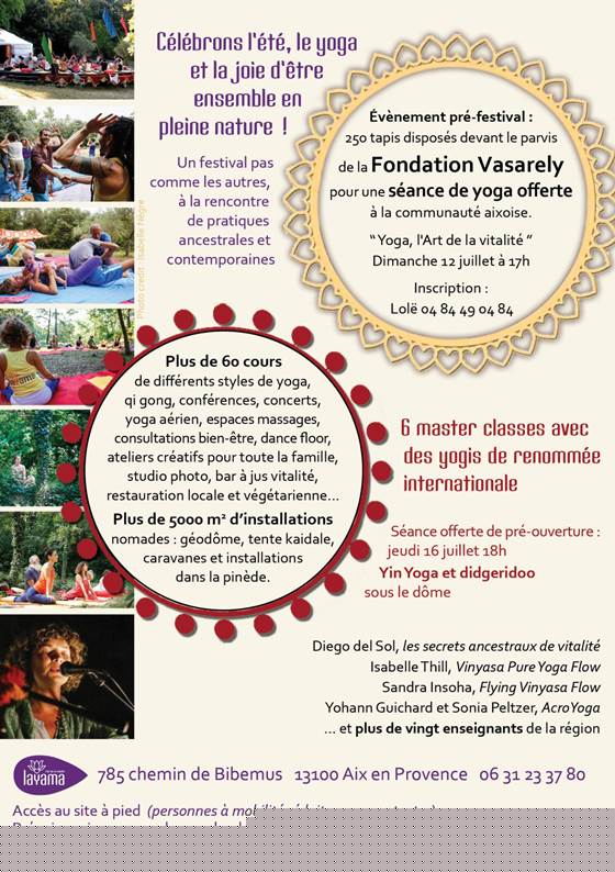 jeudi 16 juillet 18h Yin Yoga et didgeridoo sous le dômePlus de 5000 m2 d’installations nomades: géodôme, tente kaidale, caravanes et installations dans la pinède.