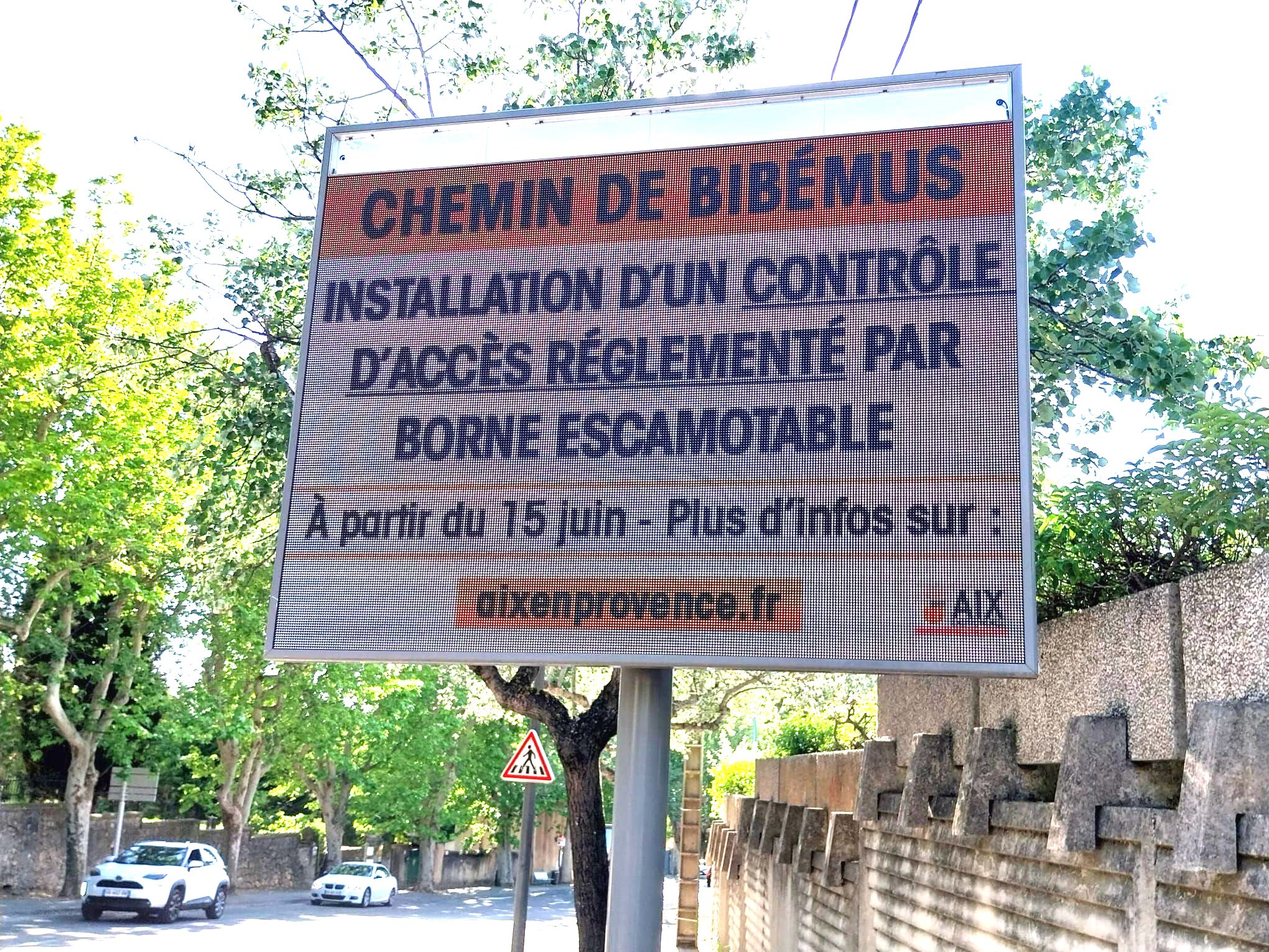 Borne du chemin de Bibemus: photo du panneau numérique Depuis la semaine dernière, aucune nouvelle information ou signalisation sur le chantier de la borne ou le long de l’avenue Fontenailles. Donc la date de mise en service de la borne télescopique est le dimanche 15 juin. La borne interdira le passage aux automobilistes 24 heures sur 24 et 7 jours sur 7 , sauf pour ceux qui ont le sésame ( voir le site de la Ville). La seule façon de monter sur le plateau sera la marche à pied (3,5 km en montée) puisqu’on ne nous parle pas de navette. Certains, nombreux, comme le CiQ, voient cela comme une privation radicale du plateau de Bibemus. Nous avons proposé d’autres moyens de régulation, peut-être que la réalité apportera des modifications….