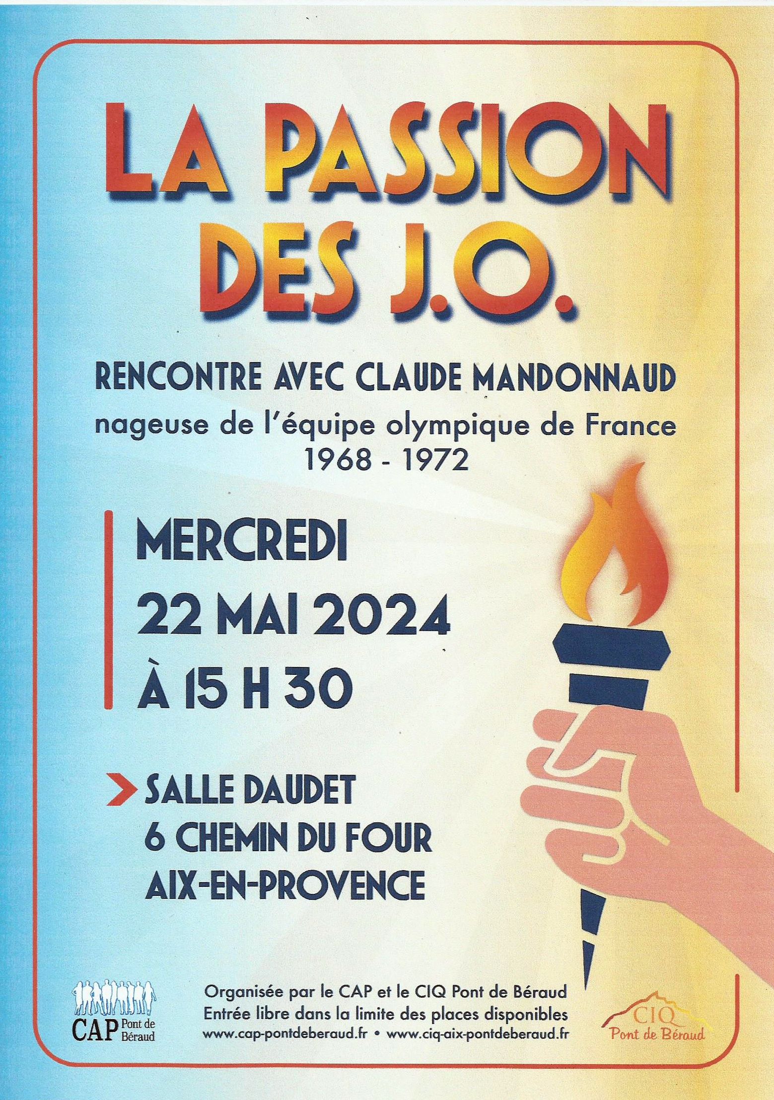 Une nouvelle fois, le CAP et le CIQ s’unissent pour vous proposer ces moments rares et précieux : nous espérons la présence des jeunes générations et des sportifs pour partager ensemble la ferveur et la passion des JO avec Claude Mandonnaud.