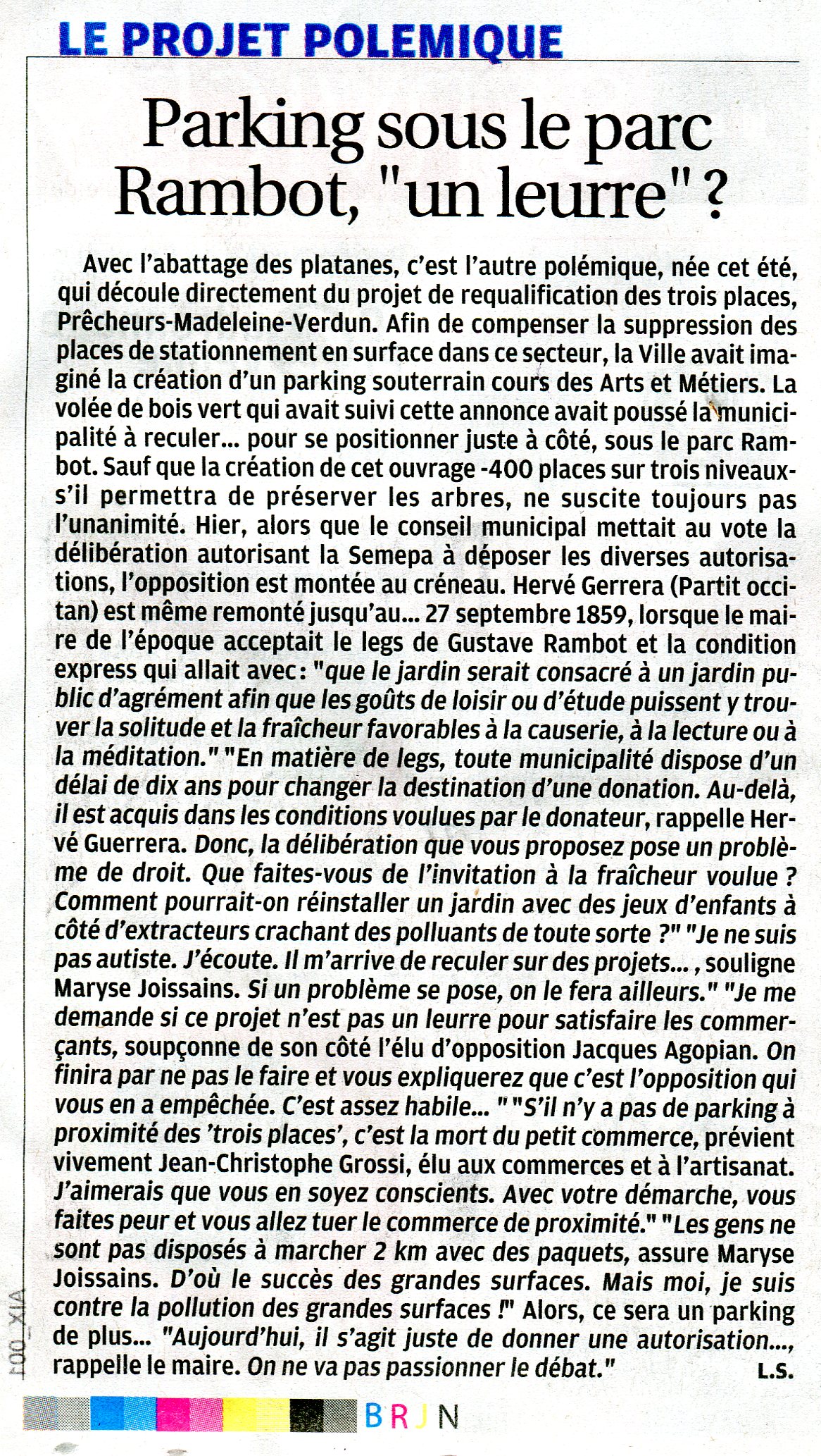 Vous êtes ici :Accueil9Actualités9« Le projet polémique » article de la Provence du samedi 24 septembre 2016, le parking sous le parc Rambot