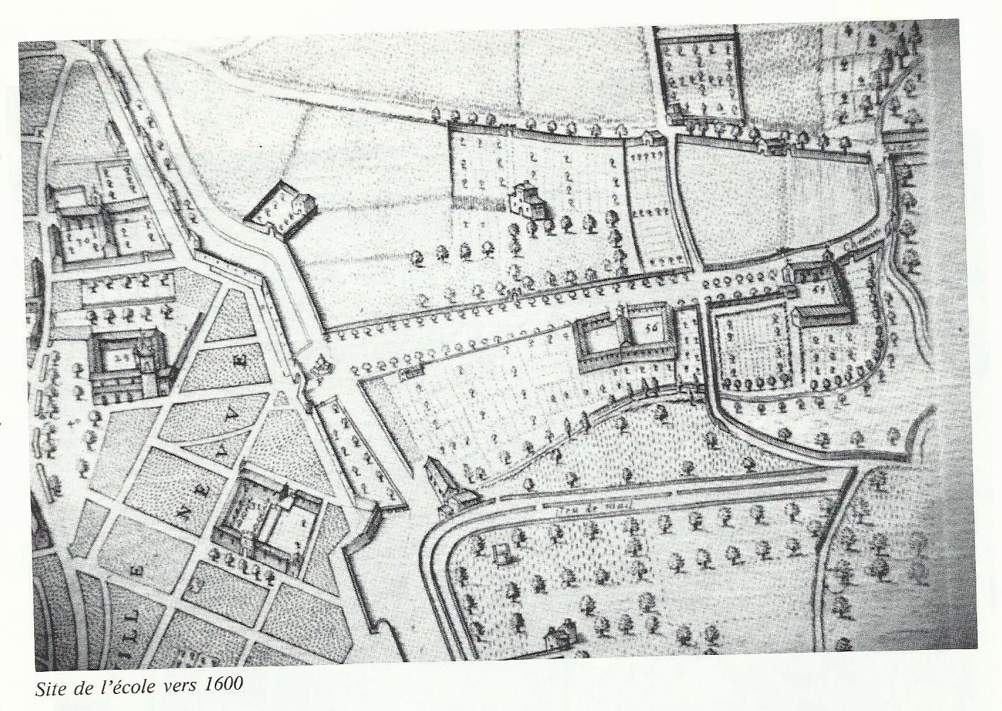 Les plans actuels de l’école se superposent aux bâtiments passés, cours, cloître, D’autres édifices sont apparus au fur et à mesure des besoins de l’école, les ateliers,