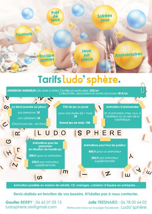 • Samedi 25 Janvier : PORTES OUVERTES à la Ludothèque. Dans le cadre de la Quinzaine pour la Jeunesse et la Famille, organisée par la ville d’Aix en Provence, la Ludo’sphère ouvre ses portes afin que vous puissiez venir nous rencontrer et découvrir le lieu qui sera désormais dédié au jeu en famille sur notre commune.