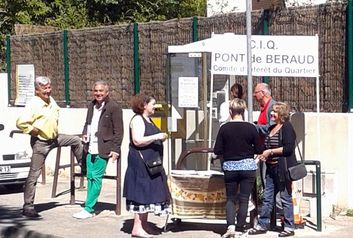 Nous étions 7 ce samedi matin du Comité d’Intérêt du Quartier Pont de Béraud à venir à votre rencontre en ce point de passage, sur l’ Av. Fontenaille, qui, dans la pratique, joue le rôle de lieu central pour notre quartier. En voiture ou à pied, vous y venez acheter votre pain, votre journal, vous venez y faire votre marché mettant en évidence l’intérêt de ces espaces commerciaux, dits de centralité, de proximité.