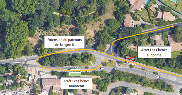 Keolis communique : « En raison de l’impossibilité de réhabiliter l’ancien poteau, l’abribus de l’arrêt Les Chênes est désormais desservi en direction du Parking des 3 Bons Dieux »: