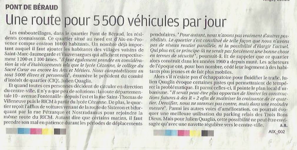 le Lundi 5 février le président du C.I.Q Pont de Béraud  a décrit la situation de notre quartier  aux journalistes de la Provence    dans le cadre d’un dossier sur la circulation à Aix:  ICI