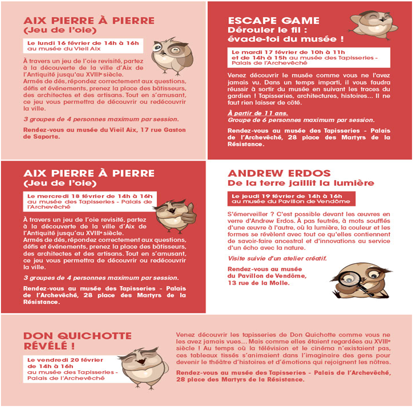 – Mes vacances aux musées : visites-ateliers pour les enfants de 7 à 11 ans .